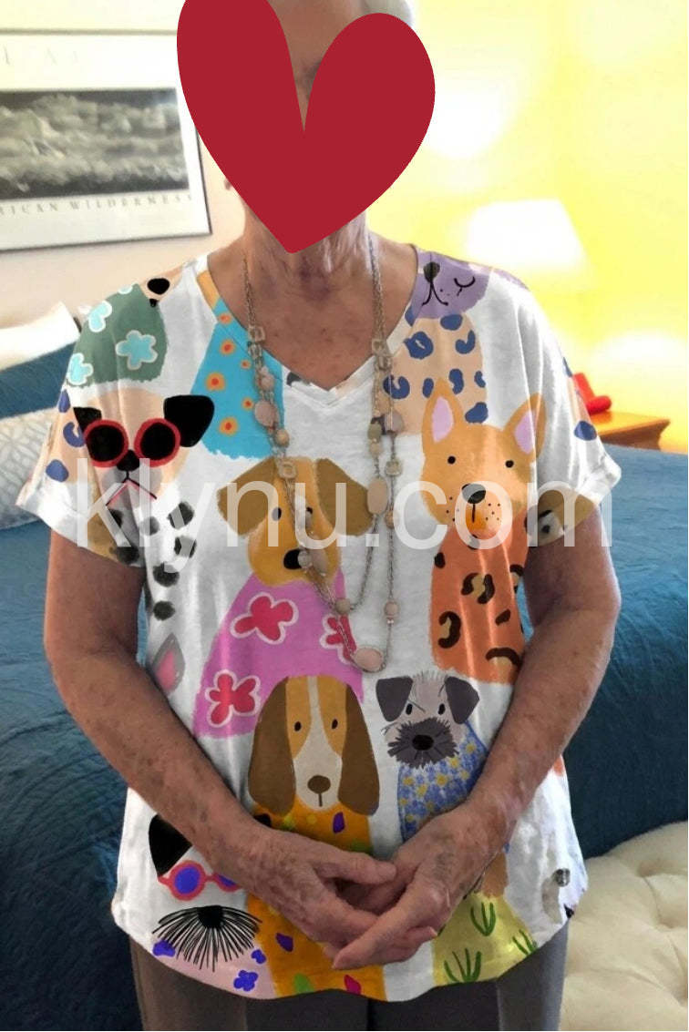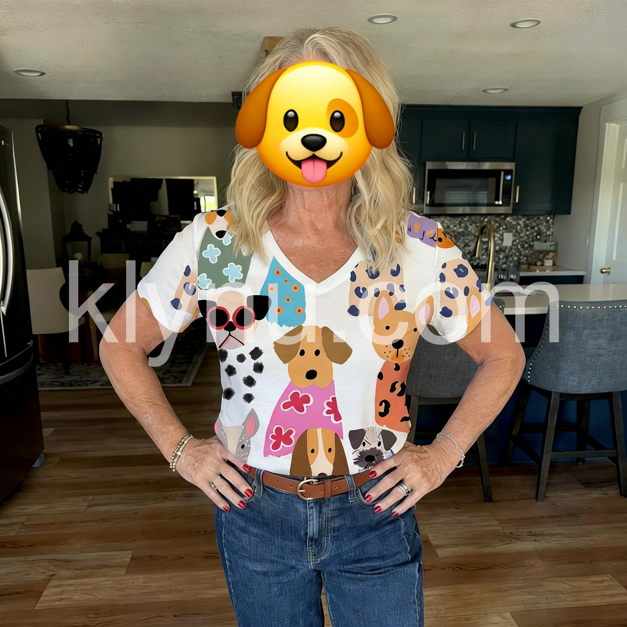Brighten your day with this Whimsical Dog Print Short Sleeve Top, a cheerful and eye-catching piece that turns heads with its playful, hand-drawn style canine illustrations. Featuring an adorable array of cartoon dogs in vibrant outfits—complete with sunglasses, floral dresses, and bold patterns—this top brings a joyful, artistic flair to any outfit. Crafted from lightweight, breathable fabric—likely cotton or linen blend—it’s perfect for warm weather and casual wear. The relaxed fit, short sleeves, and soft V-neckline offer ultimate comfort and effortless style, making it ideal for beach days, brunches, or weekend outings. Whether you're a dog lover or simply adore fun fashion, this top is a must-have statement piece that blends humor, creativity, and charm. Pair it with white jeans, denim shorts, or flowy pants for a look that's both flirty and full of personality. Inspired by the whimsical spirit of brands like Lulus, this top celebrates individuality and lighthearted fashion—perfect for those who love to express their fun side with every step.