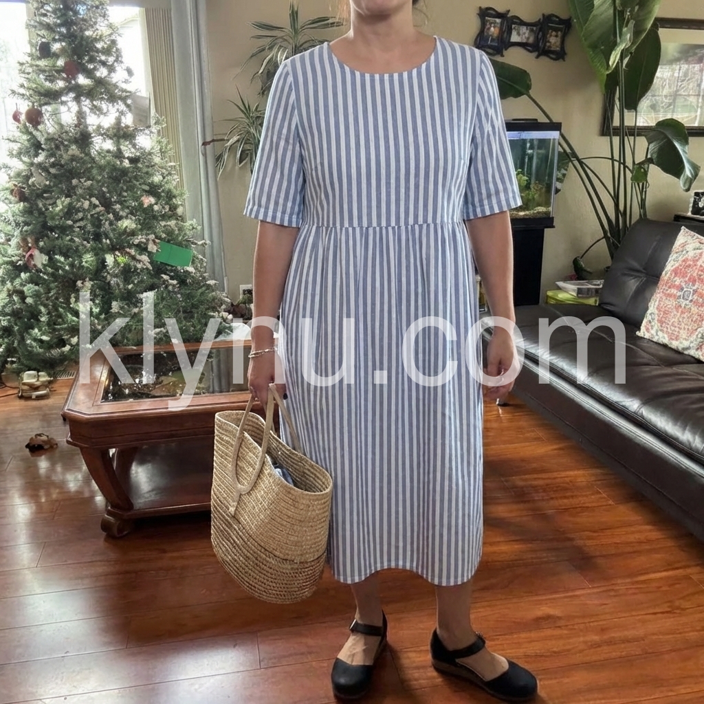 Blue White Stripe Linen Blend Midi Dress with Pockets