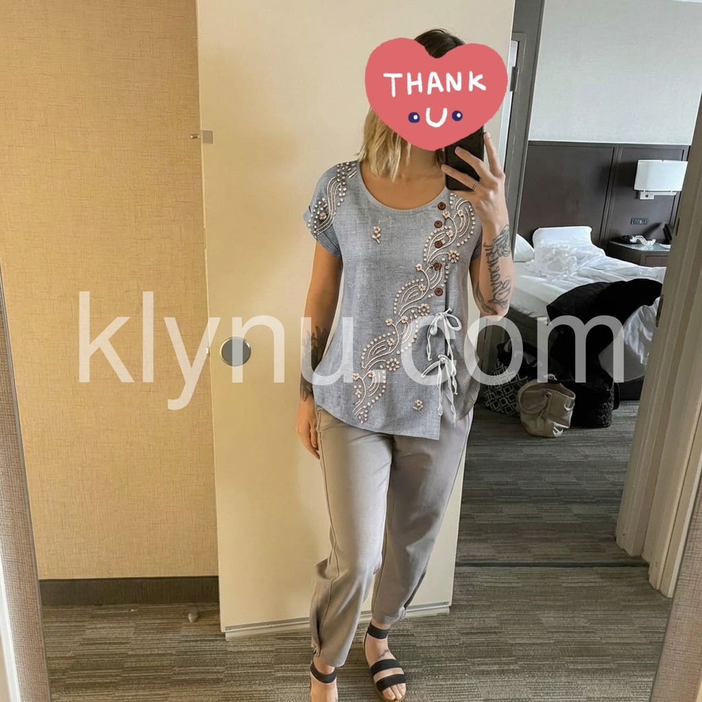 This blouse blends artisanal detail with feminine charm. The muted gray base, adorned with delicate floral and dot embroidery, evokes timeless sophistication.