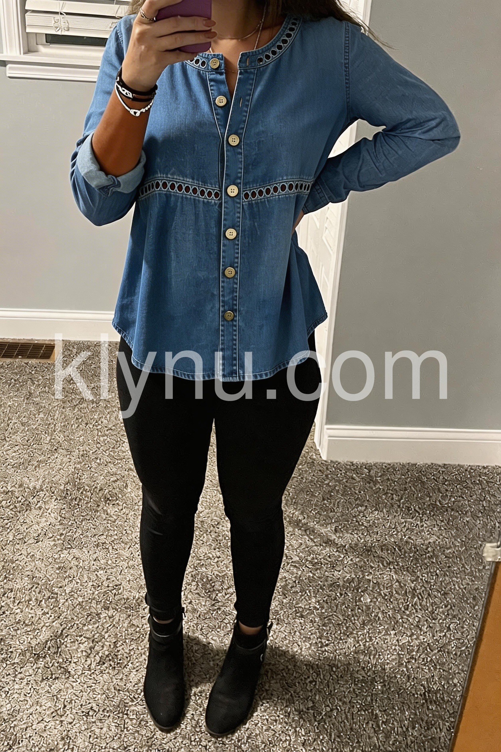 Embrace laid-back elegance in this Blue Denim Button Down Top with Embroidered Trim, a stylish and comfortable piece that blends classic denim appeal with artisanal details. Crafted from soft, medium-wash denim fabric, this tunic features a relaxed, oversized silhouette with a flattering round neckline and front button closure, offering both ease and timeless charm. The standout design element is the decorative embroidered trim—featuring a delicate dotted pattern—accenting the neckline and waistline, adding a touch of boho flair and texture. Styled here with layered necklaces, bracelets, and distressed denim bottoms, it’s ideal for weekend errands, coffee dates, or a leisurely walk through the city.
