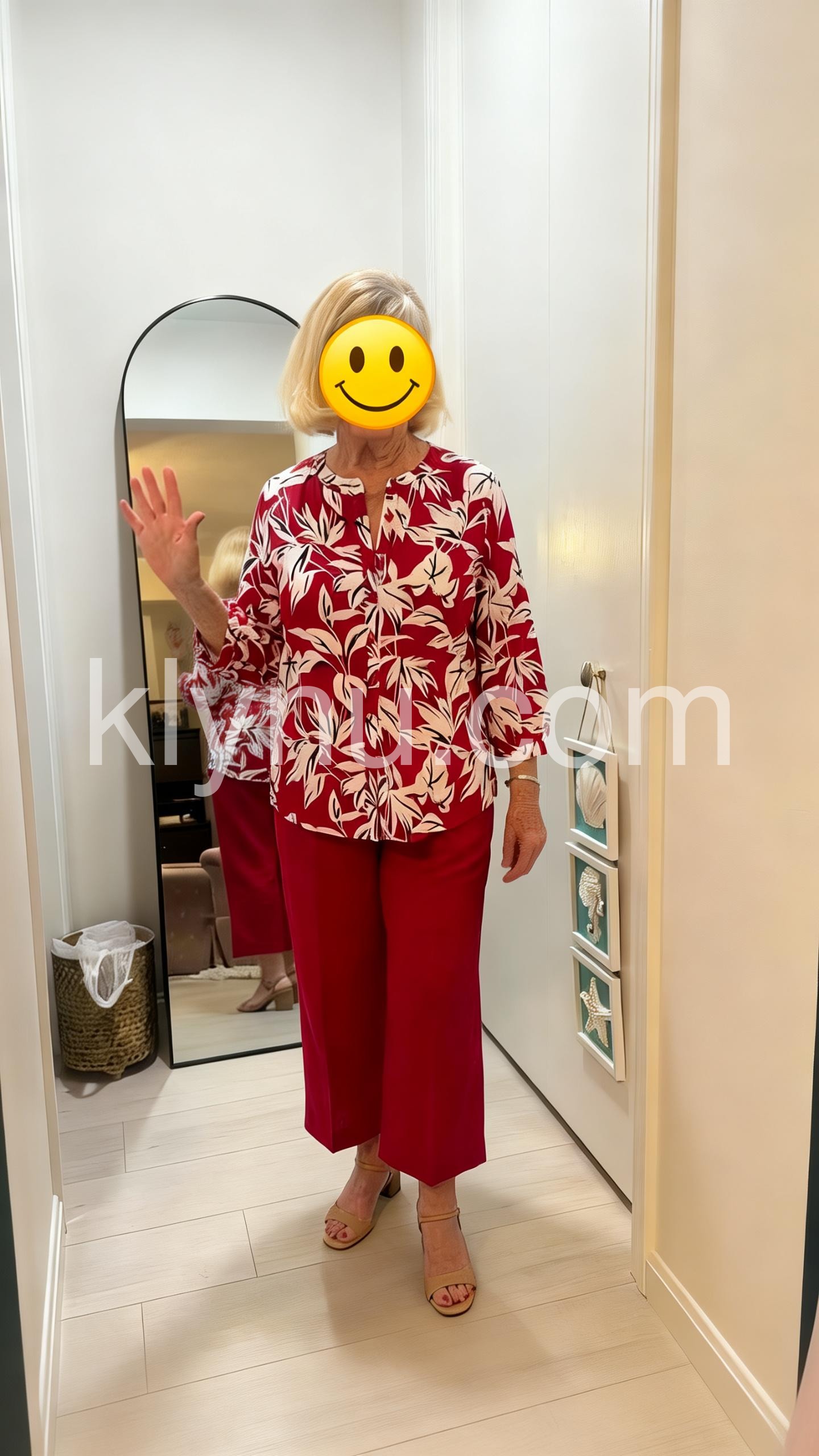 This coordinated set features a vibrant red blouse with white leaf print and button-front detail. Paired with matching cropped pants for a polished look. The three-quarter sleeves add a touch of elegance. Perfect for casual outings or warm-weather events. Confident, chic, and easy to wear.