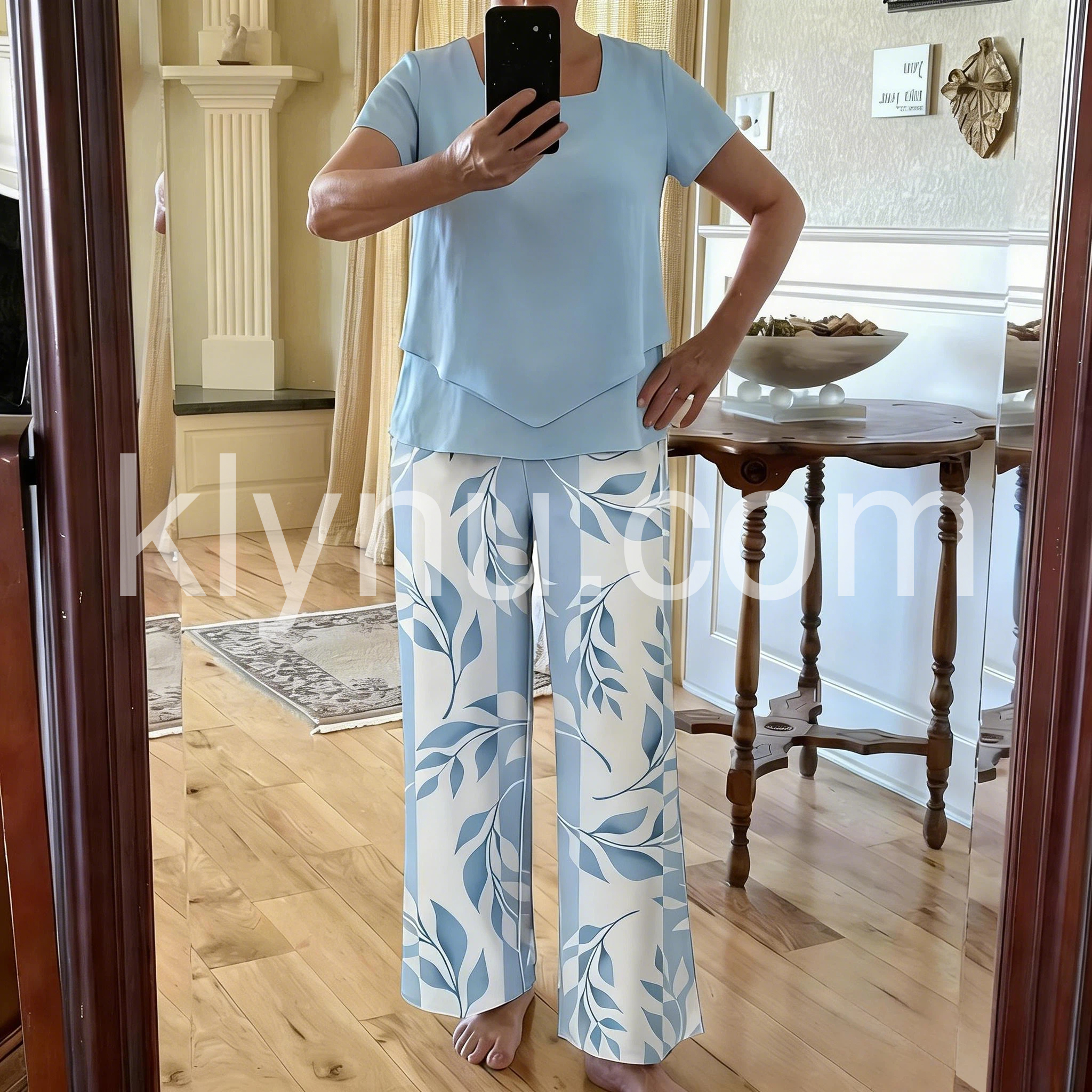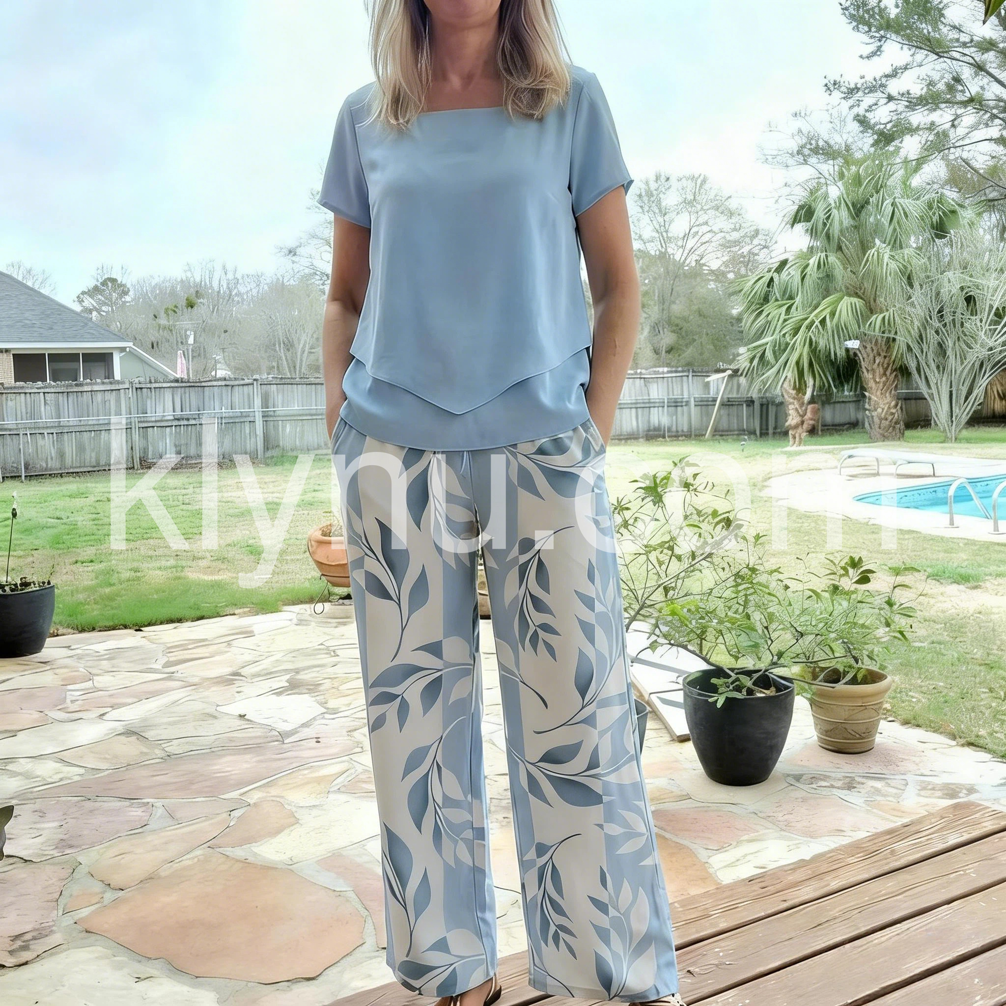 This two-piece set features a relaxed-fit top with a layered hem. Paired with wide-leg pants in a soft leaf print. Lightweight and breathable fabric perfect for warm days. Ideal for casual outings or lounging. Stylish and effortless.