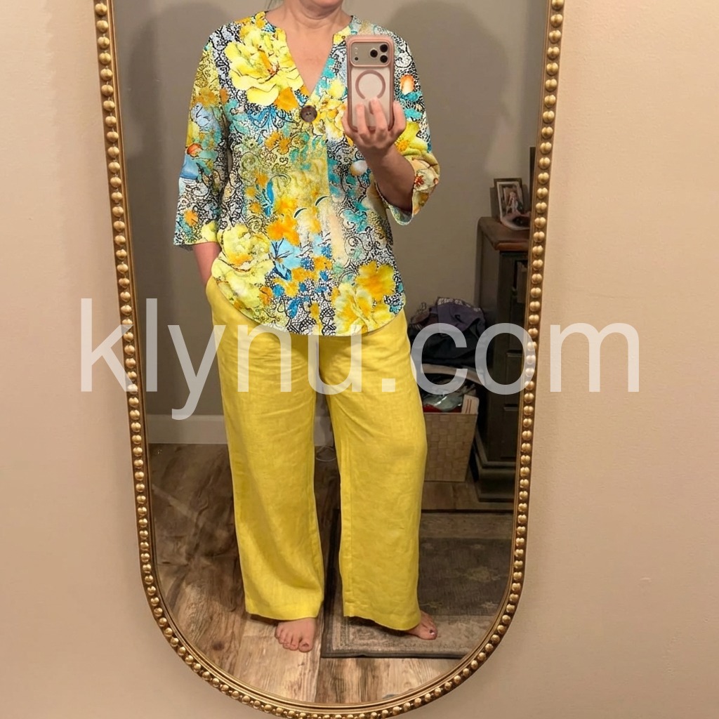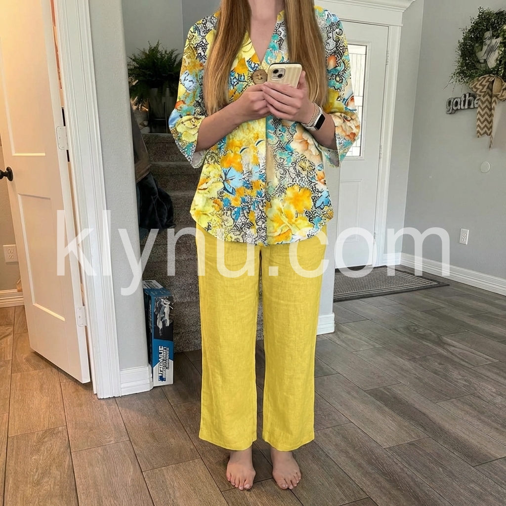 This eye-catching two-piece set features a bold floral blouse with a V-neck and button front. Paired with bright yellow wide-leg pants for a breezy look. Lightweight fabric perfect for warm weather. Ideal for beach walks or casual summer days. Fresh and stylish.