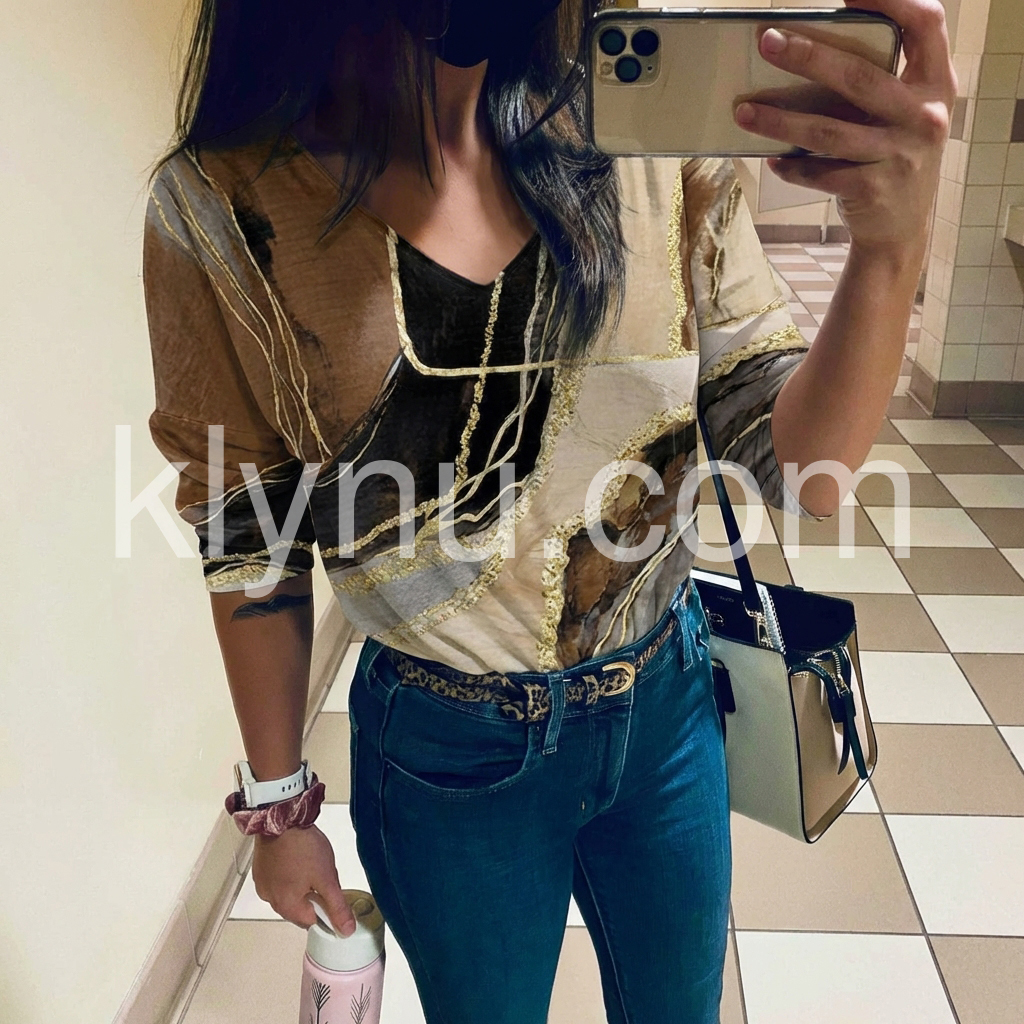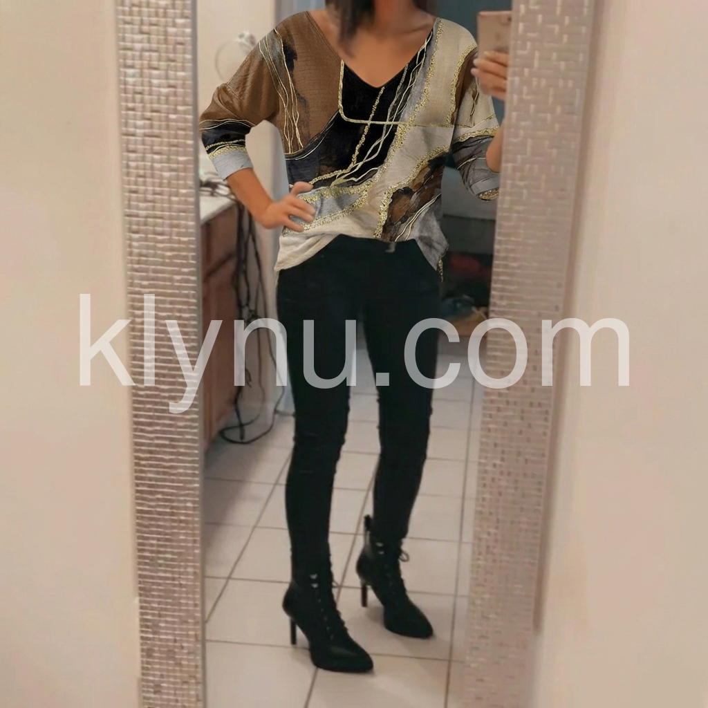 This loose-fitting top features a bold abstract design in earthy tones with gold accents. Deep V-neckline and long sleeves for a relaxed look. Lightweight fabric perfect for casual wear. Stylish and easy to pair with pants or skirts. Effortlessly chic for everyday style.
