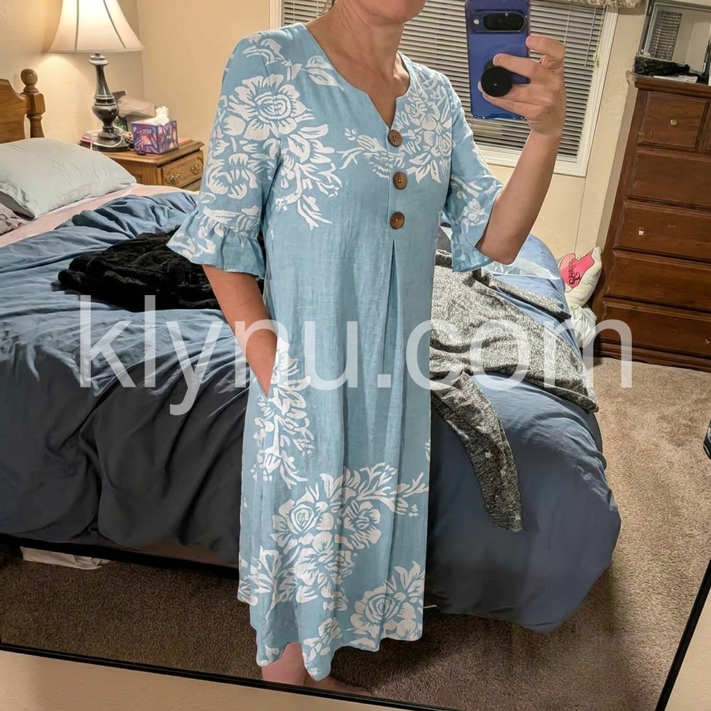 Blue Floral Ruffle Sleeve Button Linen Maxi Dress