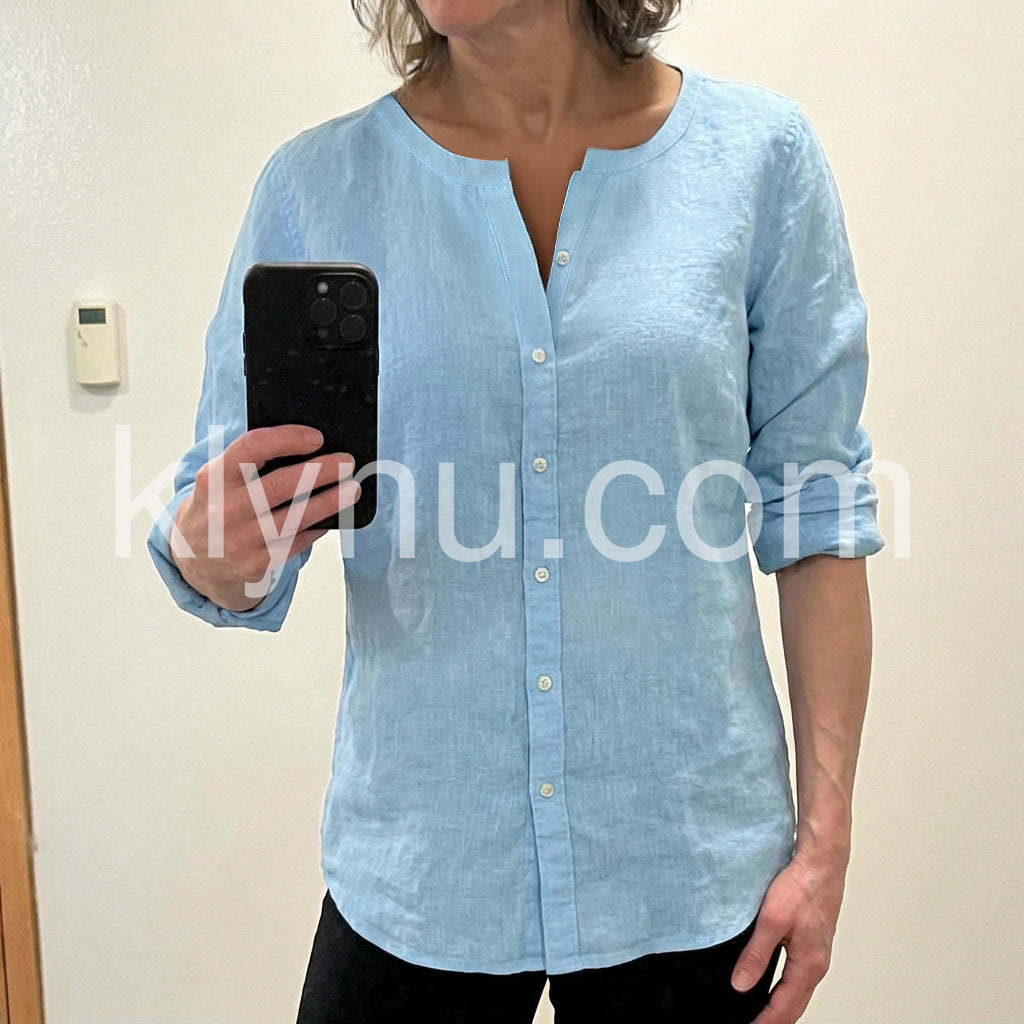 Elevate your everyday style with this Soft Blue Linen-Blend Button Up Blouse, a breath of fresh air for warm-weather wardrobes. Crafted from lightweight, breathable fabric with a subtle linen texture, this blouse offers a relaxed yet polished silhouette that’s perfect for both casual and semi-formal settings. Featuring a clean V-neckline with a split front detail, it adds a touch of modern elegance, while the full-length sleeves can be rolled up for a laid-back, effortless look. The soft sky-blue hue exudes calm sophistication, making it easy to pair with jeans, trousers, or skirts. Whether you're heading to the office, meeting friends for coffee, or enjoying a weekend stroll, this versatile top brings comfort and style in one. Inspired by the minimalist, curated fashion found on Lulus.com, it’s ideal for those who love timeless pieces with a hint of coastal charm. A wardrobe staple that combines simplicity, comfort, and understated beauty—perfect for women who appreciate effortless chic.