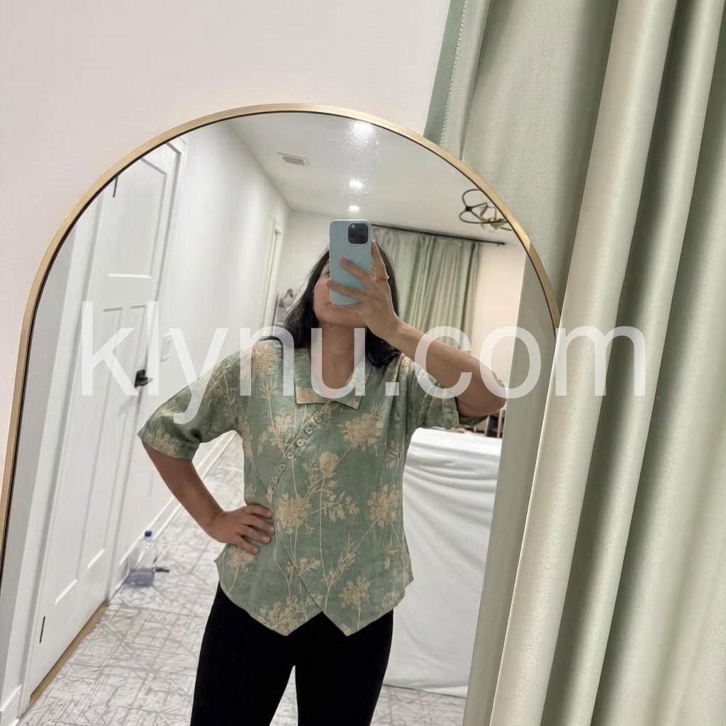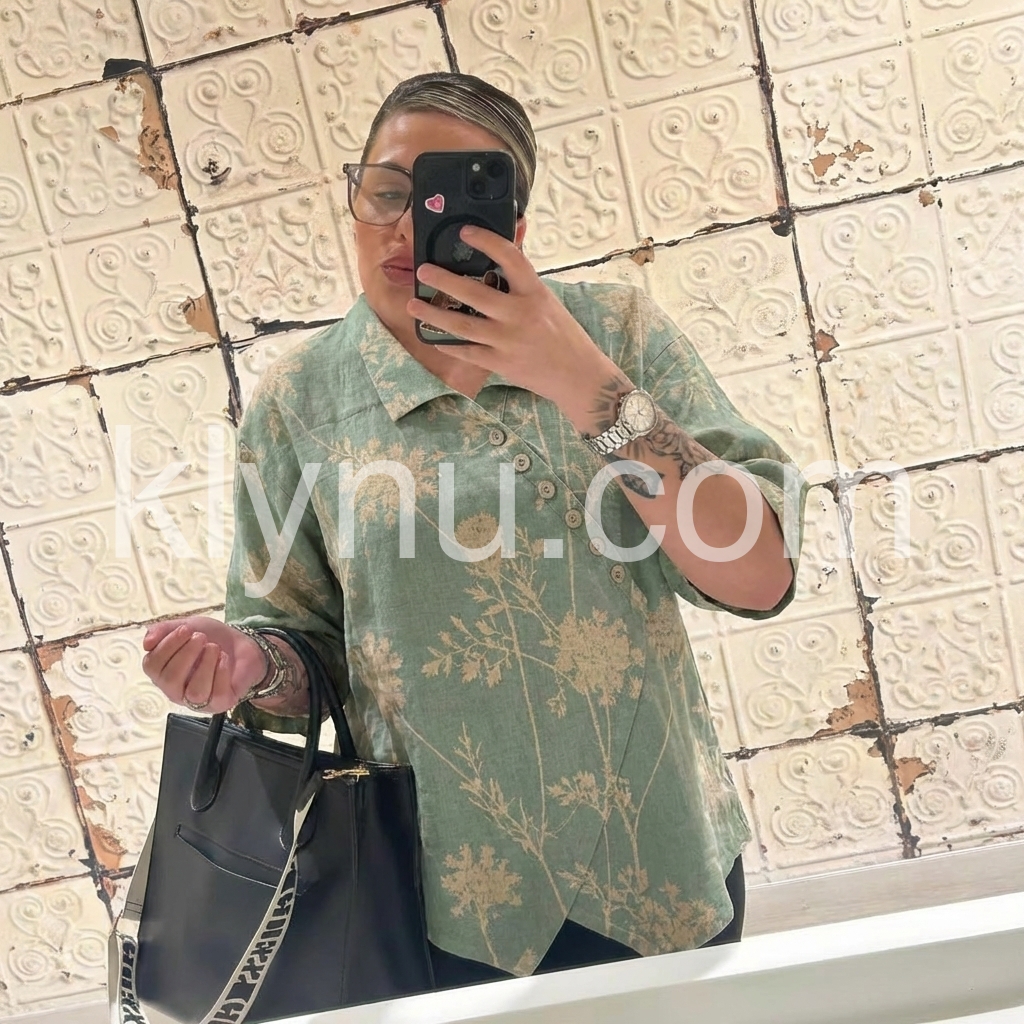 This V-neck top features a soft green base with a subtle floral print and wrap-front design. Button-down detail adds a touch of elegance. Short sleeves and relaxed fit for comfort. Perfect for casual outings or everyday wear. Effortlessly stylish with a bohemian vibe.