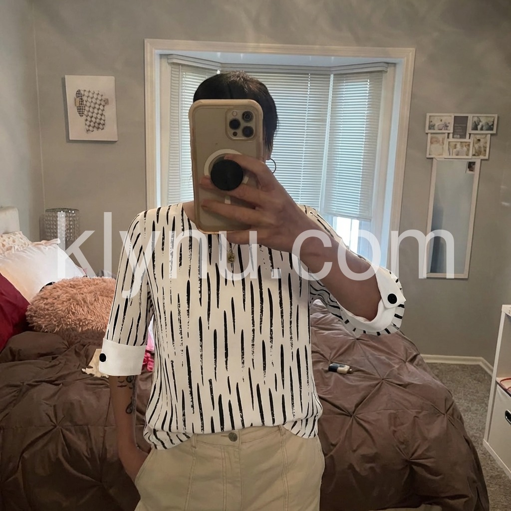 Style# 1545417Elevate your everyday wardrobe with understated sophistication. This loose-fit top showcases a striking black brushstroke pattern against crisp white, creating an artistic statement that whispers rather than shouts. The round neckline offers clean minimalism, while three-quarter sleeves with buttoned cuffs introduce a polished, intentional detail. Crafted from a breathable cotton-elastane blend, it moves with you effortlessly—whether you're navigating the office, meeting friends for brunch, or enjoying a weekend escape. The relaxed silhouette flatters all body types while maintaining an air of refined ease. Machine washable for hassle-free care. This is the piece that transforms a basic outfit into something memorable.
