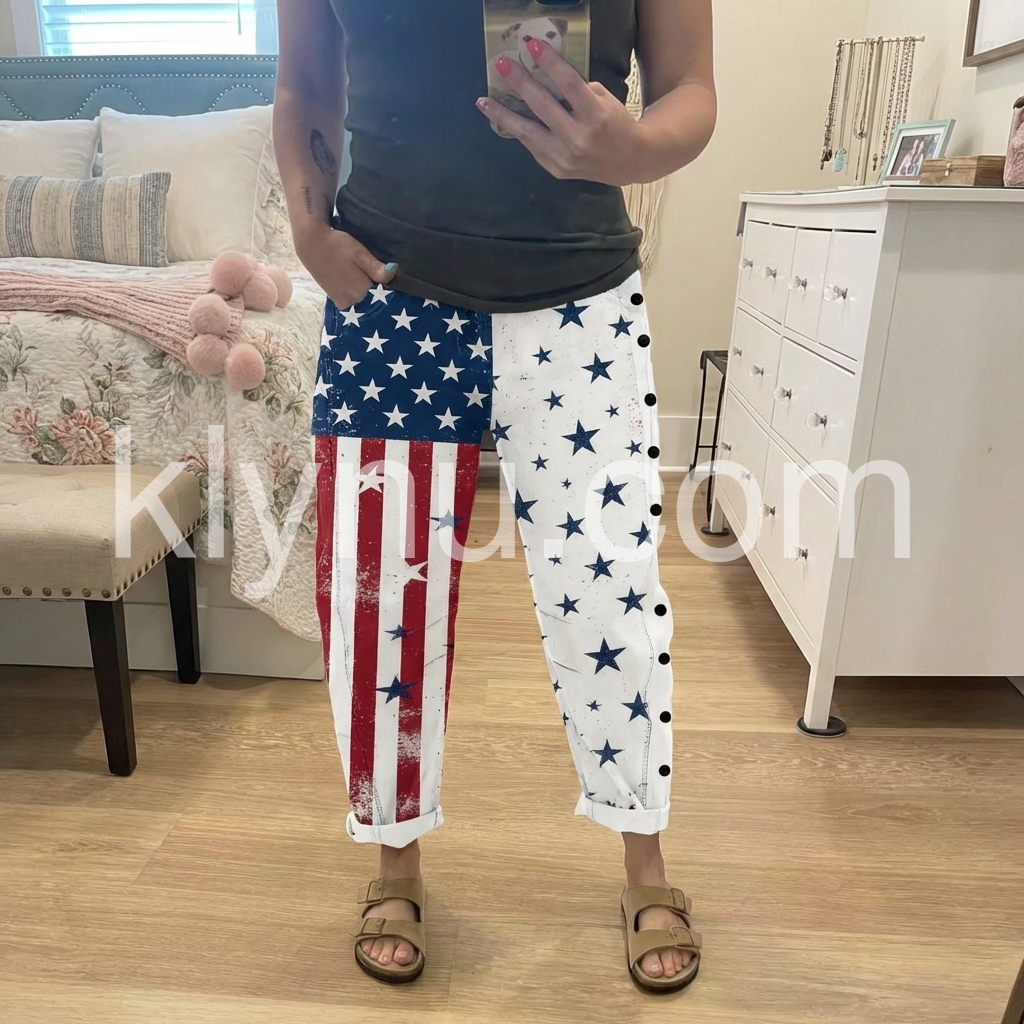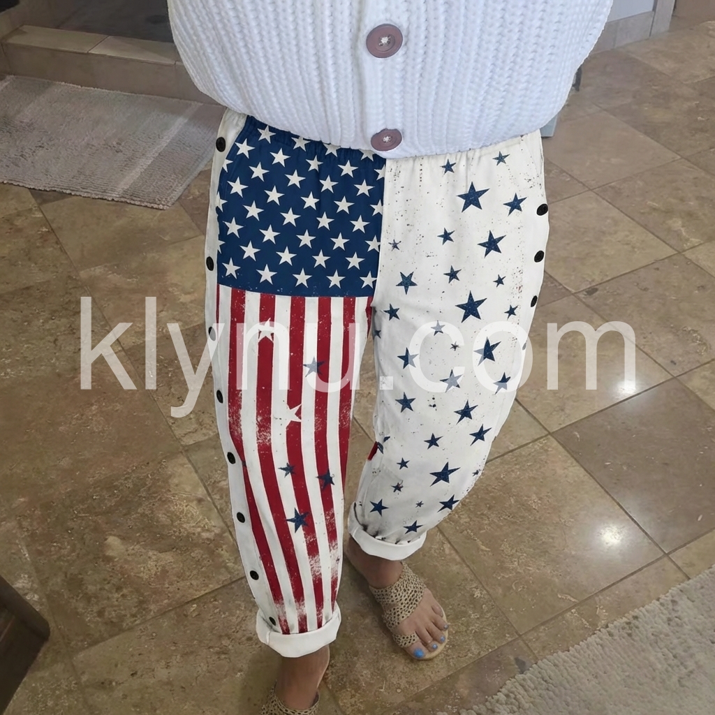 These loose-fit pants feature a bold American flag print with stars and stripes on one leg. Side button details add a unique touch. Elastic waistband and cuffed hems for comfort. Lightweight fabric perfect for casual wear. Ideal for summer outings or festive occasions.