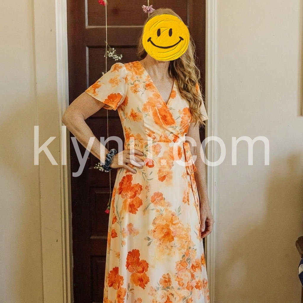 The vibrant orange watercolor floral print on a soft white base is eye-catching and cheerful.
