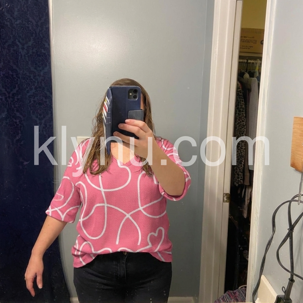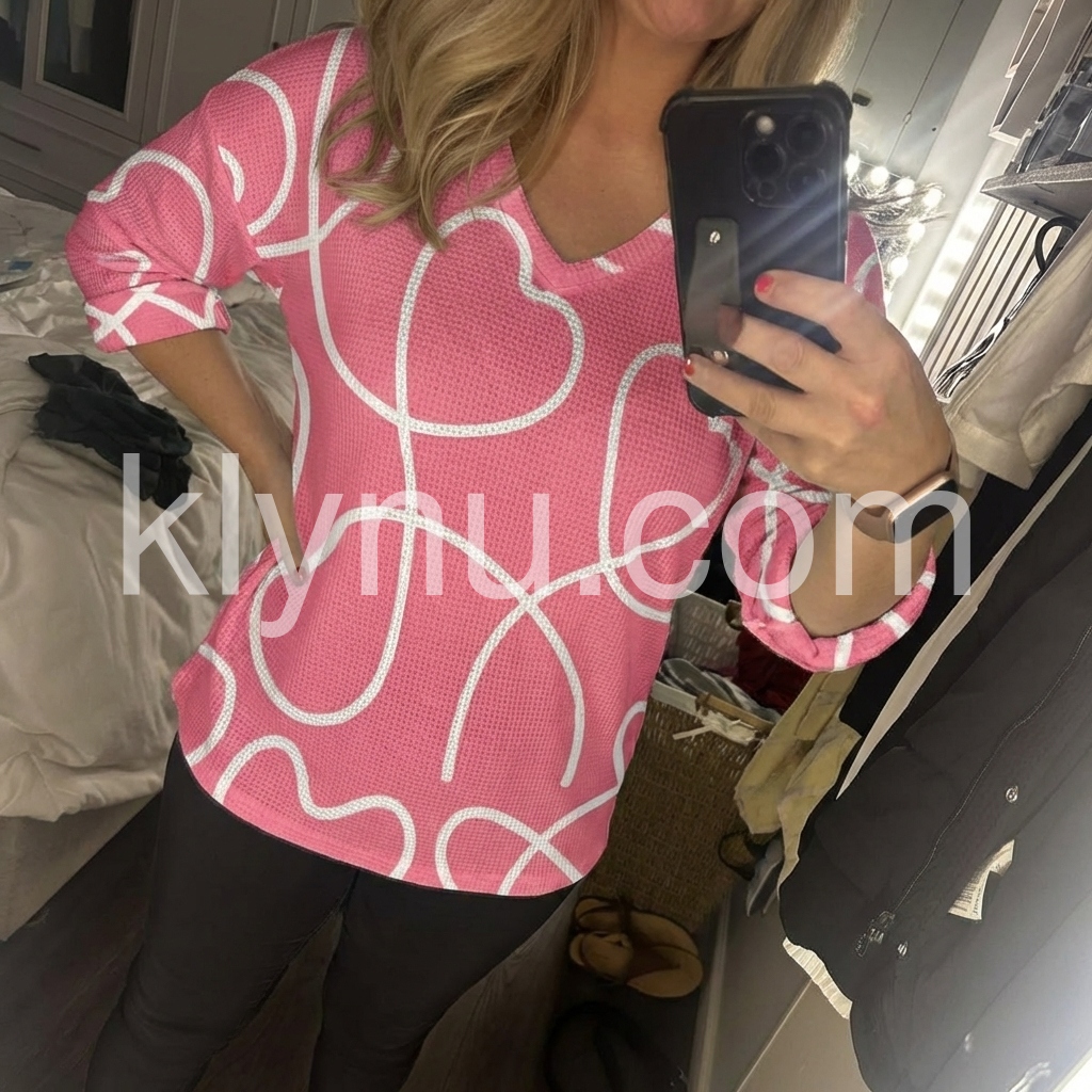 Elevate your casual wardrobe with this refined V-neck top, featuring a delicate heart outline design in soft pink. The flattering V-neckline creates a sophisticated silhouette while the minimalist graphic adds a touch of understated elegance. Crafted for versatility, this piece transitions seamlessly from day to evening, pairing effortlessly with jeans, skirts, or tailored trousers. The gentle pink hue complements a wide range of skin tones and coordinates with most color palettes. Perfect for those who appreciate subtle style details and quality basics that work harder in any wardrobe.