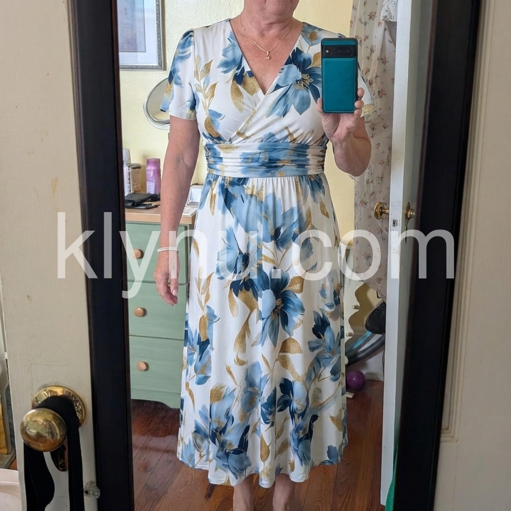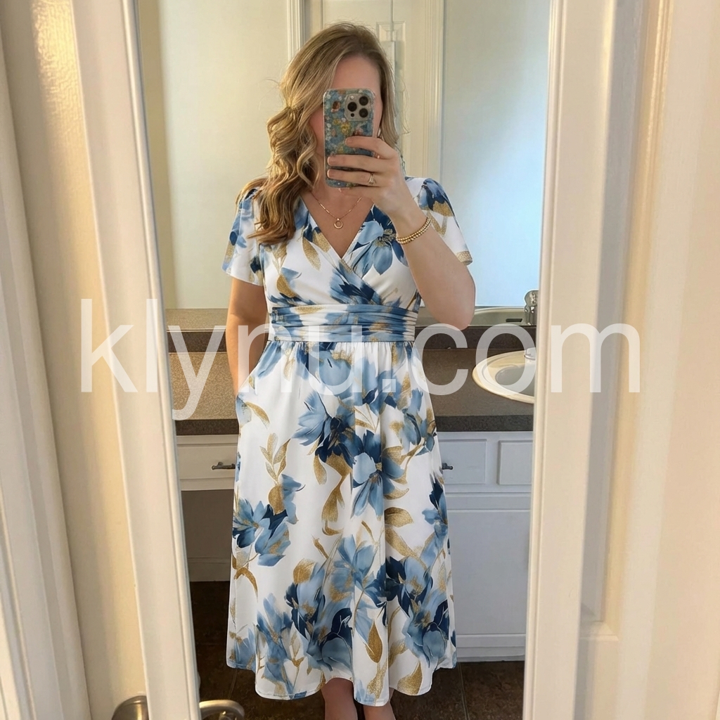 The wrap V-neck, ruched waist create a figure-flattering silhouette, ideal for date nights and special events, blending botanical beauty with contemporary style.
