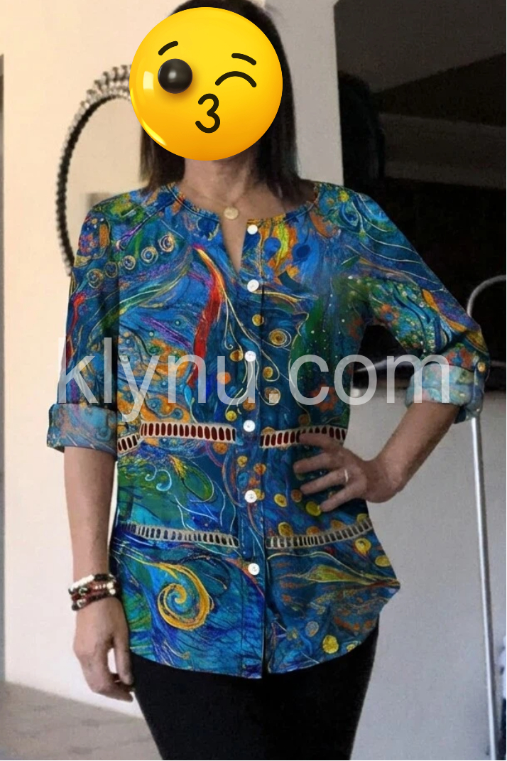 This long-sleeve button-up top features a bold blue base with colorful abstract patterns. The relaxed fit and rolled sleeves add comfort and style. Perfect for casual wear or bohemian outfits. Pair with jeans or leggings for effortless flair. Lightweight fabric ideal for warm days.