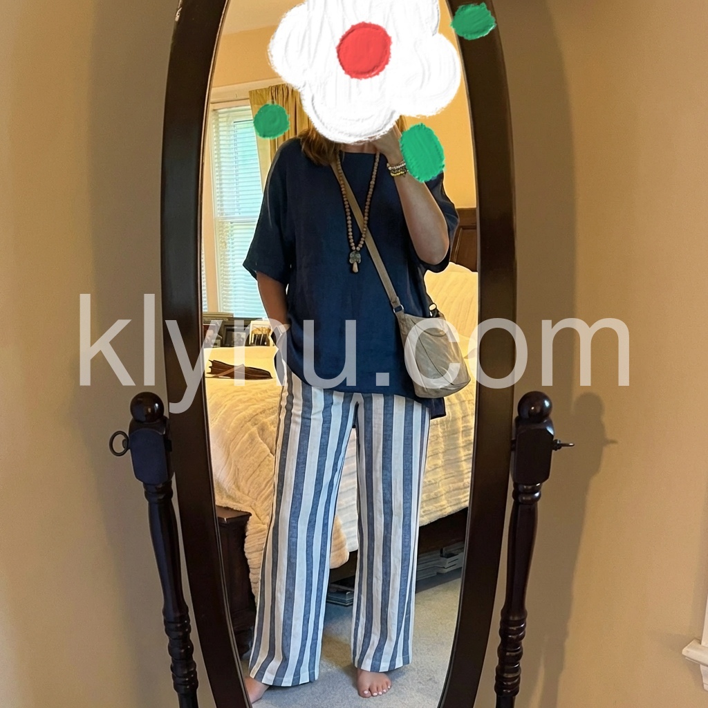 This relaxed outfit features a navy asymmetrical tunic with a flowing silhouette. Paired with wide-leg pants in bold blue and white stripes. Lightweight fabric perfect for warm days. Ideal for casual outings or beachwear. Effortlessly stylish and comfortable.