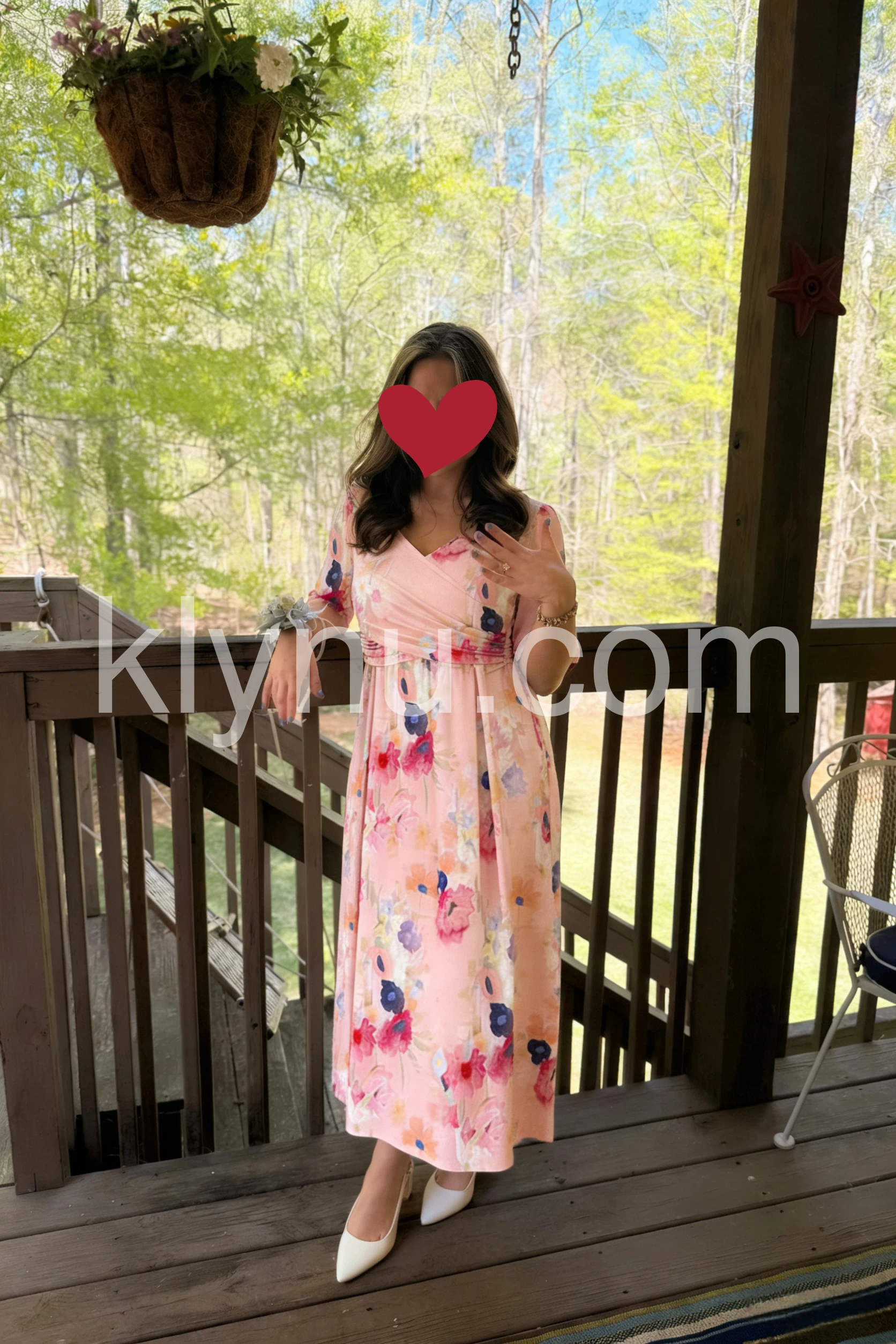 This midi dress features a soft pink base with vibrant floral prints. The V-neck and short sleeves offer a feminine touch. Side pockets add practicality and ease. Lightweight fabric perfect for spring or summer days. Ideal for casual outings or garden parties.