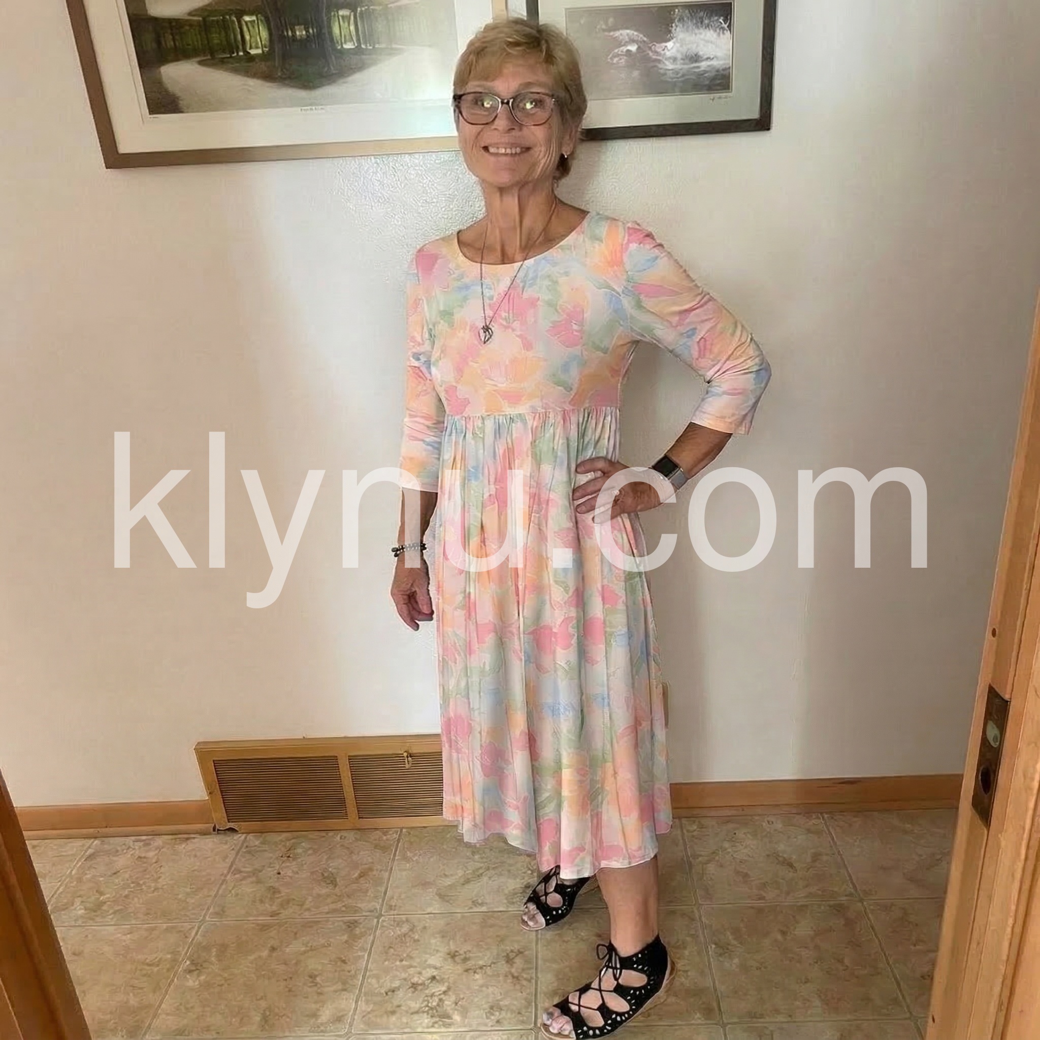 This three-quarter sleeve dress features a delicate pastel floral print. The round neckline and smocked waist offer a flattering fit. Side pockets add practicality and comfort. Lightweight fabric perfect for spring and summer. Ideal for casual outings or garden parties.