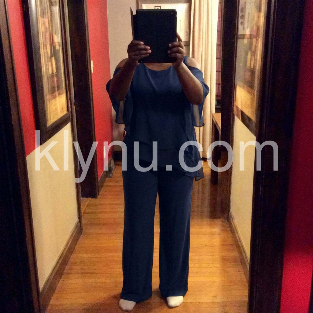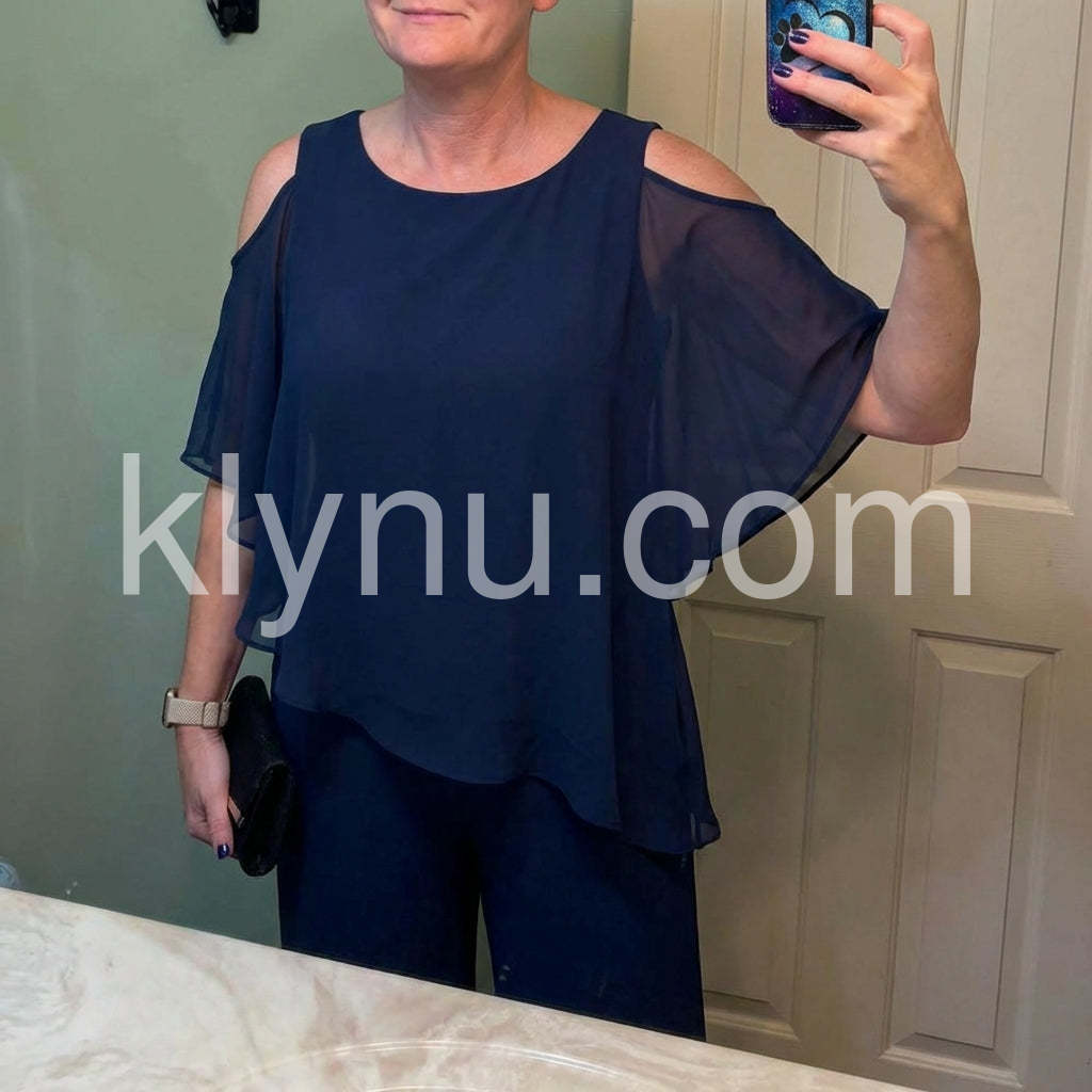 This fashionable two-piece set includes a navy cold shoulder three-quarter length draped sleeves and asymmetrically layered ruffled top and pants. Crafted from lightweight and soft materials, this set is perfect for any occasion. Step up your look with this stylish set.