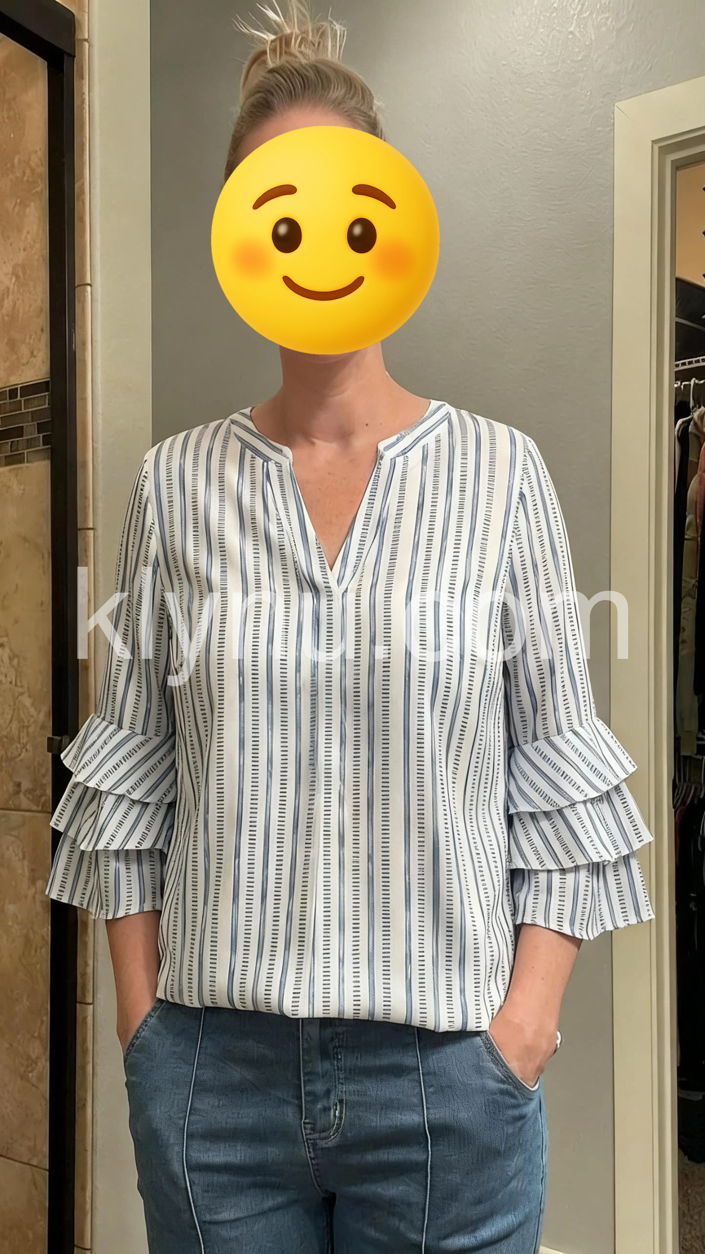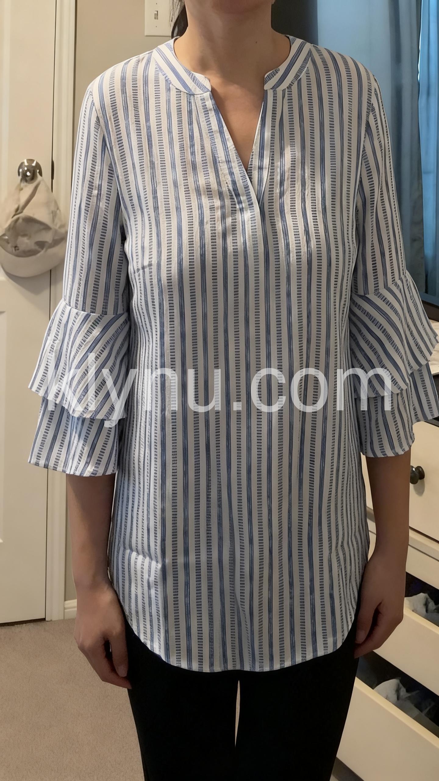 This V-neck top features vertical blue and white stripes with a relaxed, flowy silhouette. The dramatic ruffle sleeves add a feminine touch. Lightweight fabric perfect for warm weather. Pair with jeans or shorts for a breezy, beach-ready look. Ideal for casual summer days.