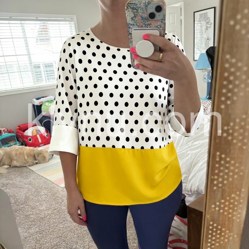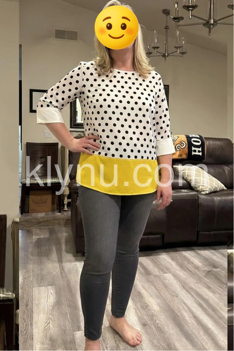 This fashion-forward top features a white base with black polka dots and a vibrant yellow hem. Three-quarter sleeves with rolled cuffs for a modern touch. Relaxed fit and round neckline for comfort. Perfect for casual wear or adding a pop of color to any outfit. Effortlessly chic and eye-catching.