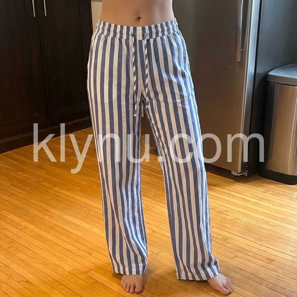These relaxed-fit pants feature bold vertical stripes in navy and white. Elastic waistband with drawstring for comfort. Wide-leg design and lightweight fabric perfect for summer. Ideal for beach outings or casual wear. Effortlessly stylish and breezy.