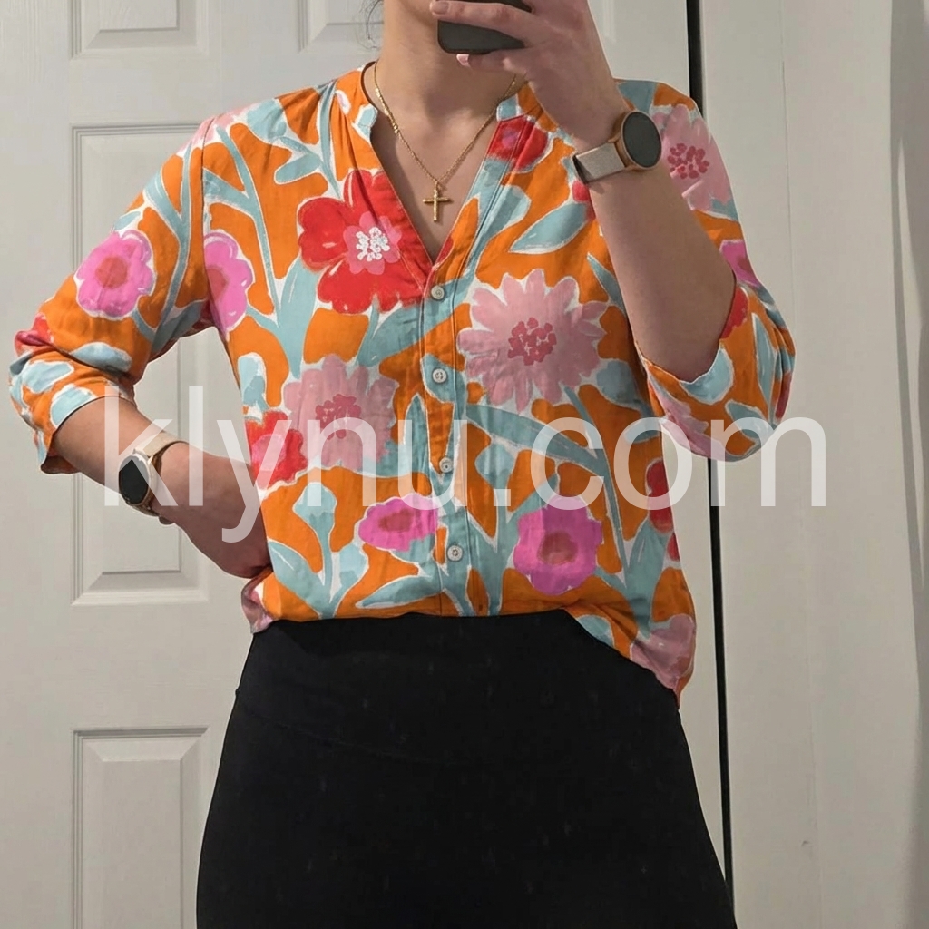 This blouse is a wearable canvas of bold, modern art. The warm orange base, printed with vibrant watercolor florals, turns every look into a statement.
