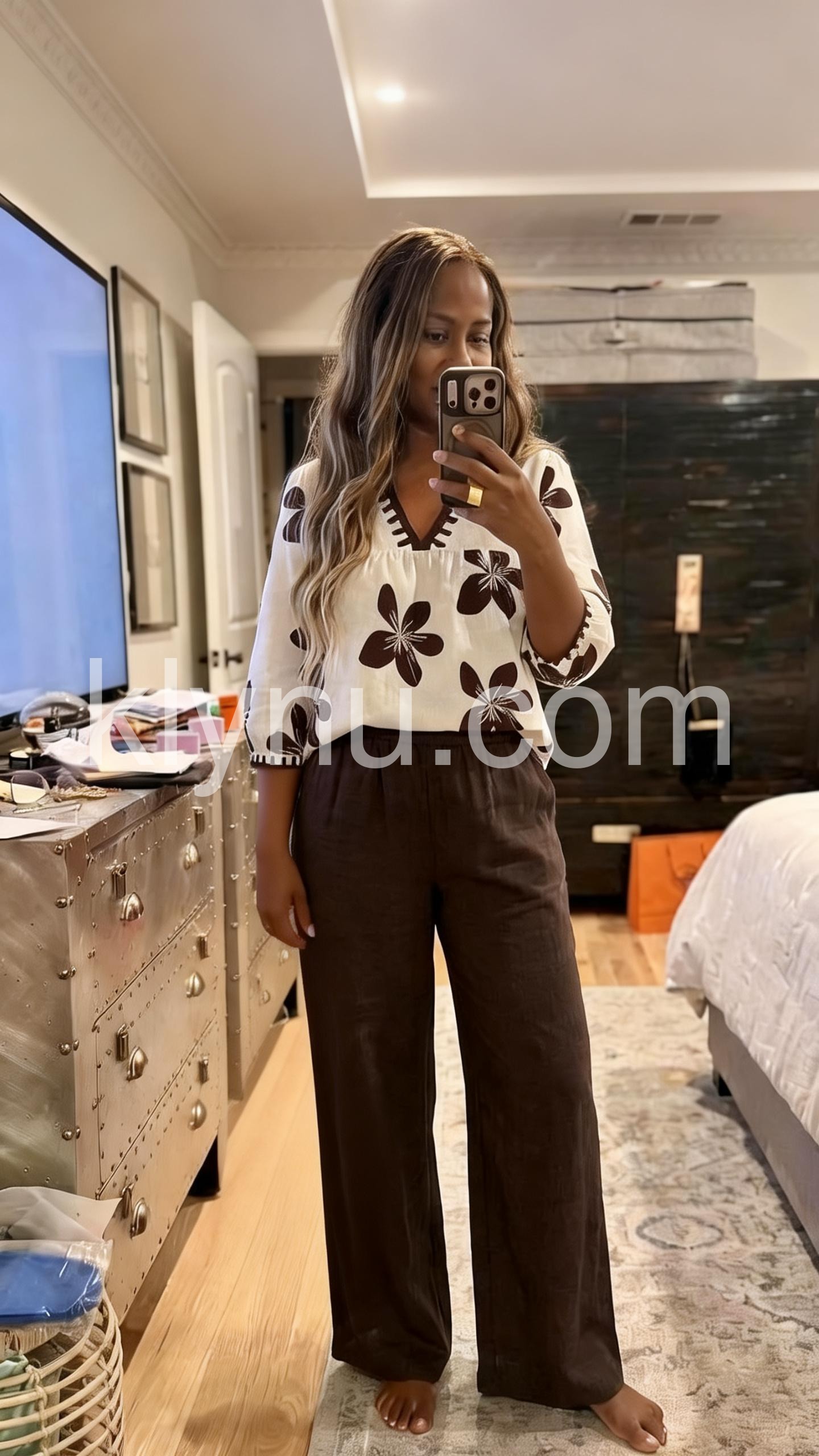 This coordinated set features a relaxed-fit top with bold black floral prints and a V-neckline. Paired with soft, wide-leg pants in dark gray for a balanced look. Lightweight fabric perfect for casual wear. Ideal for everyday comfort or summer outings. Effortlessly stylish and easy to style.