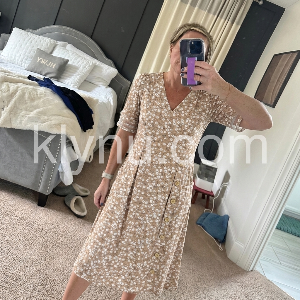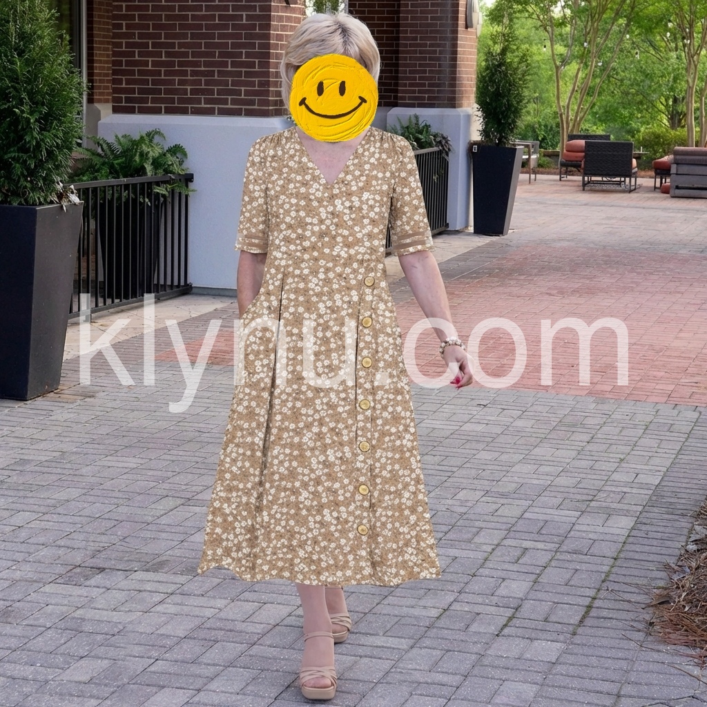 Khaki Ditsy Floral V-Neck Button Midi Dress