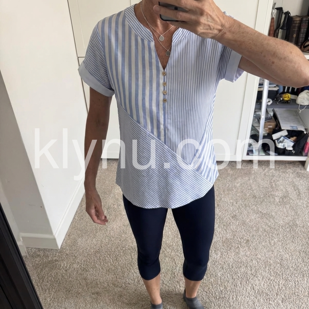 This short-sleeve top features vertical blue and white stripes. V-neckline with front buttons and a stylish wrap design. Cuffed sleeves add a polished touch. Lightweight and perfect for casual wear. Ideal paired with jeans or trousers.