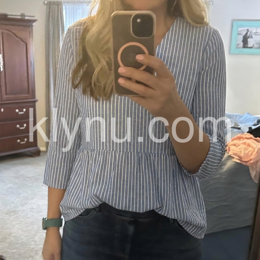 This relaxed-fit tunic features vertical blue and white stripes with a soft V-neckline. Three-quarter sleeves with rolled cuffs for a casual look. Gathered waist creates a flattering silhouette. Lightweight fabric perfect for everyday wear. Ideal for pairing with jeans or leggings.