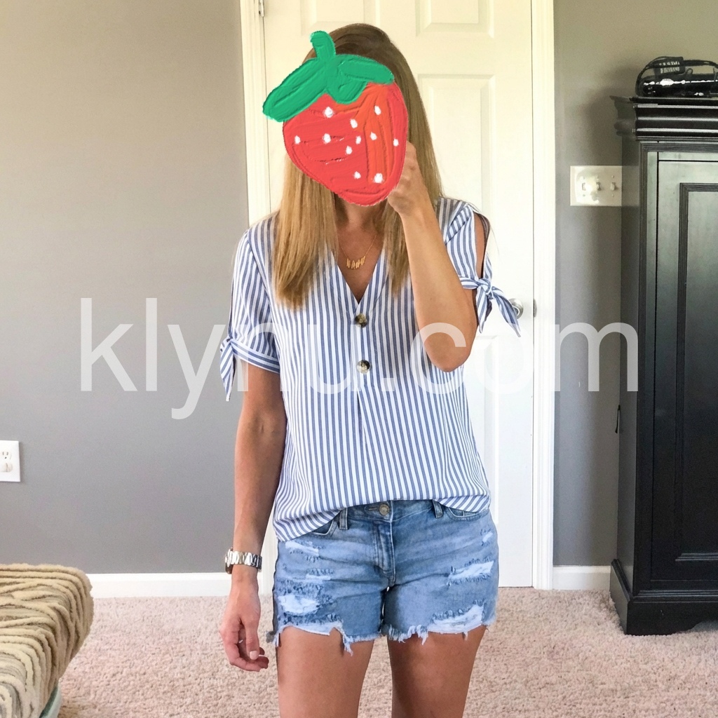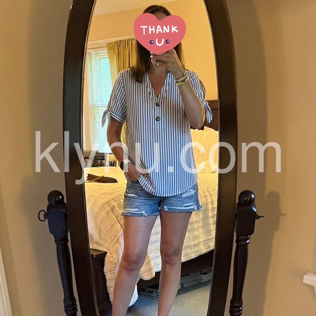 This short-sleeve top features vertical blue and white stripes. V-neckline with front button closure for a clean look. Side cut-outs with tied sleeves add a trendy touch. Relaxed fit for comfort and ease. Perfect for casual summer outfits.
