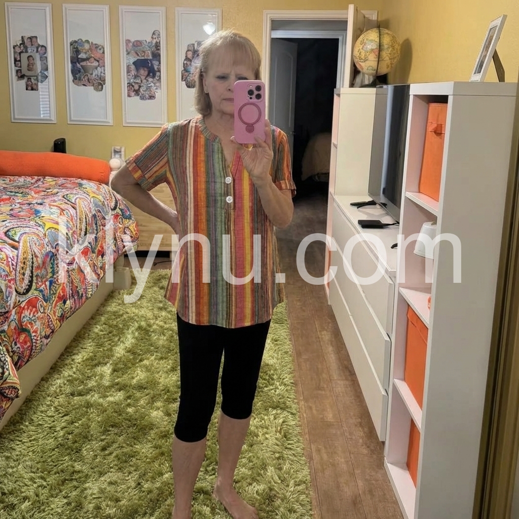 This short-sleeve top features bold vertical stripes in warm tones of orange, red, green, and yellow. V-neckline with button detail for a relaxed look. Lightweight linen blend perfect for summer. Effortlessly stylish and easy to pair. Ideal for casual outings or vacation wear.