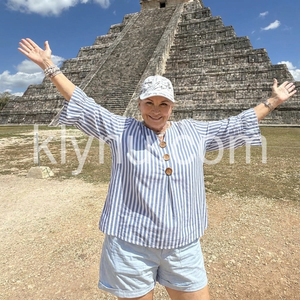 This three-quarter sleeve top features vertical blue and white stripes. V-neckline with front wooden buttons for a relaxed look. Flared ruffle cuffs add delicate detail. Lightweight fabric perfect for casual wear. Ideal for pairing with jeans or skirts.