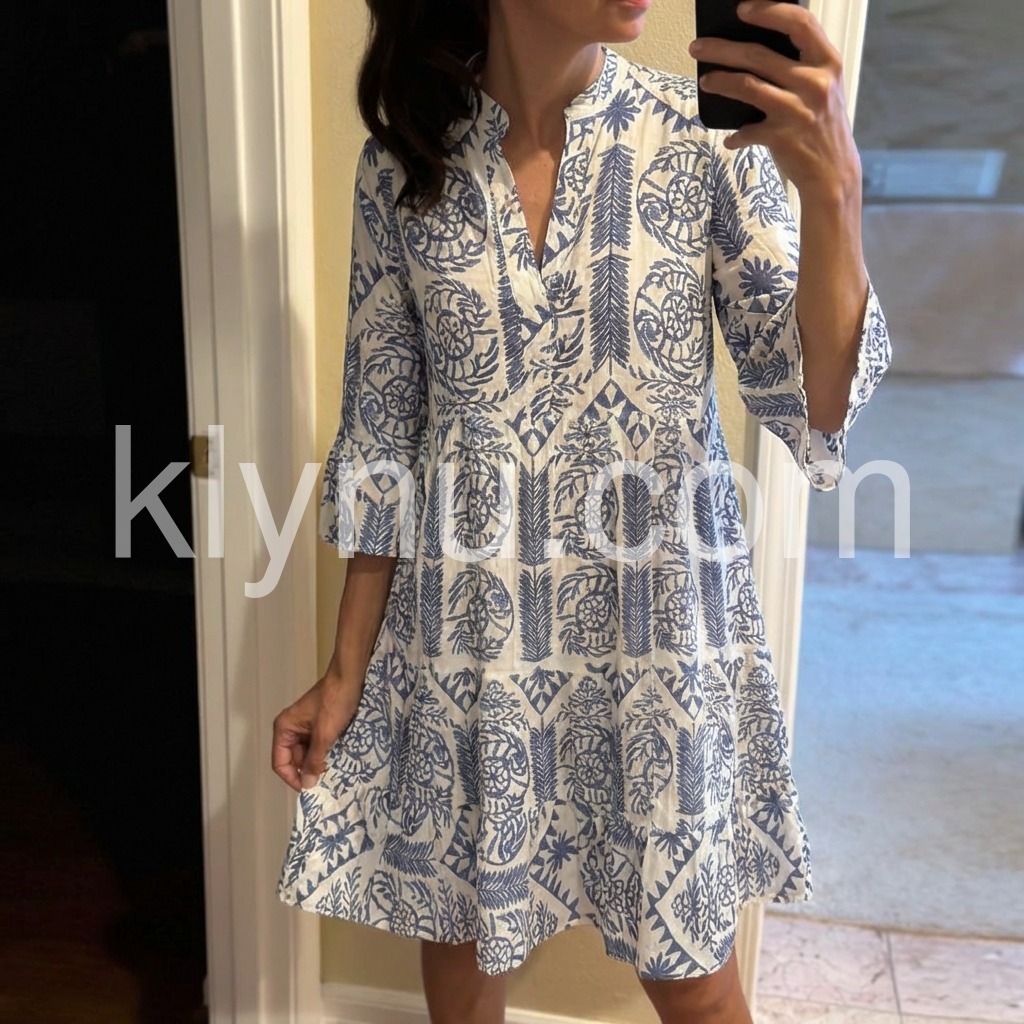 Blue V-Neck 3/4 Sleeve Mini Dress