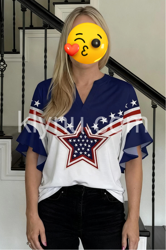 This V-neck top features a bold American flag-inspired design with red, white, and blue stars. The ruffled sleeves add a feminine flair. Loose fit for comfort and ease. Perfect for 4th of July or patriotic events. Ideal for casual summer wear.