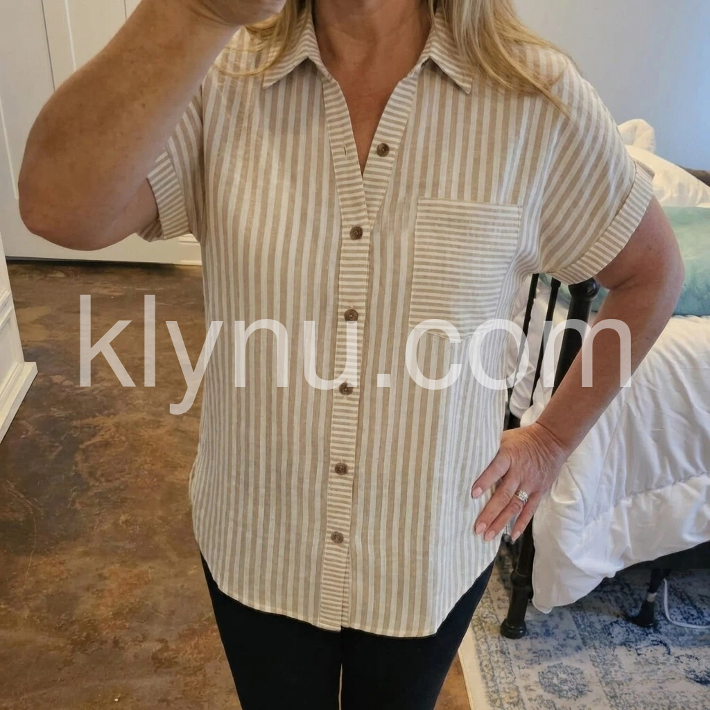 This short-sleeve shirt features vertical brown and white stripes with a classic collar. Front button closure and chest pocket add practical style. Soft, lightweight fabric for all-day comfort. Perfect for casual wear or layering. Effortlessly chic and easy to pair.