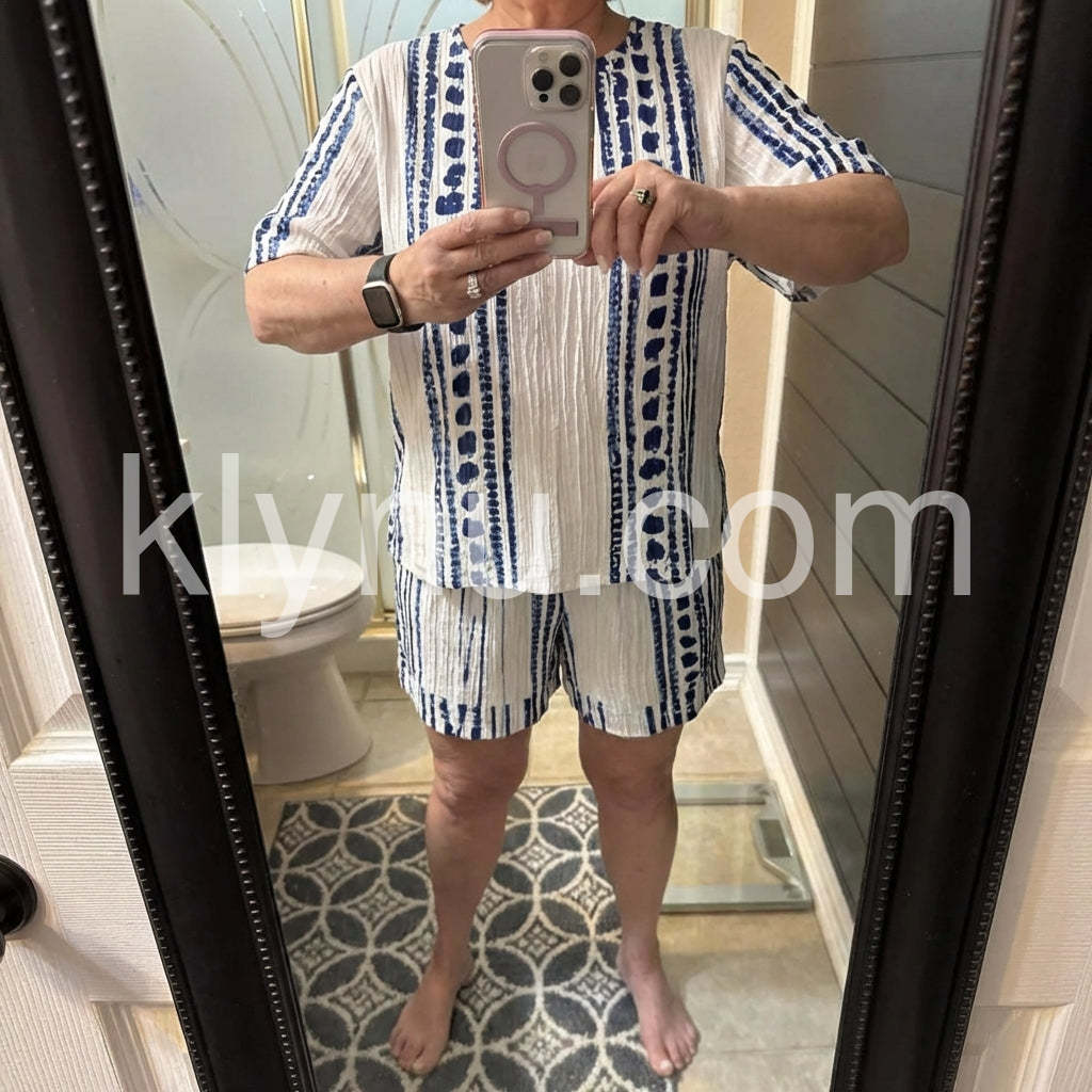 This matching set is absolutely delightful. The white and blue stripes look fresh and crisp, and the fabric feels light and breathableerfect for warm days. The fit is true to size, and the relaxed short silhouette is flattering and comfortable. The straw bag adds a perfect, tropical touch that ties the whole look together. Customer service was responsive, and delivery was quick, making the shopping experience smooth from start to finish. Highly recommend for a chic, effortless summer outfit.