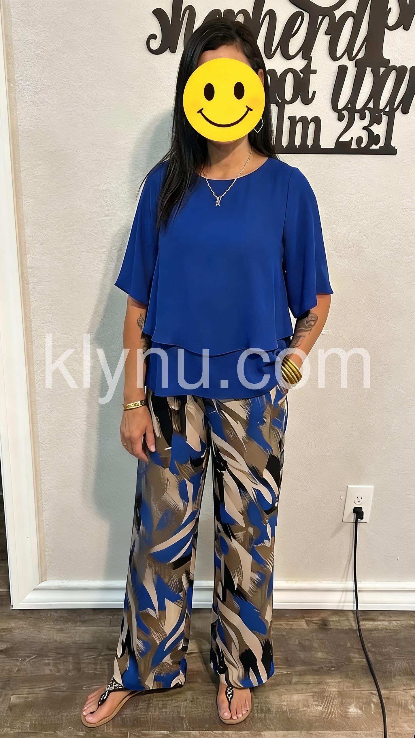 This coordinated outfit features a flowy royal blue top with a layered hem and wide-leg pants in a vibrant abstract print. The mix of solid and patterned pieces creates a modern, eye-catching look. Perfect for casual outings or warm-weather days. Comfortable, confident, and effortlessly chic.