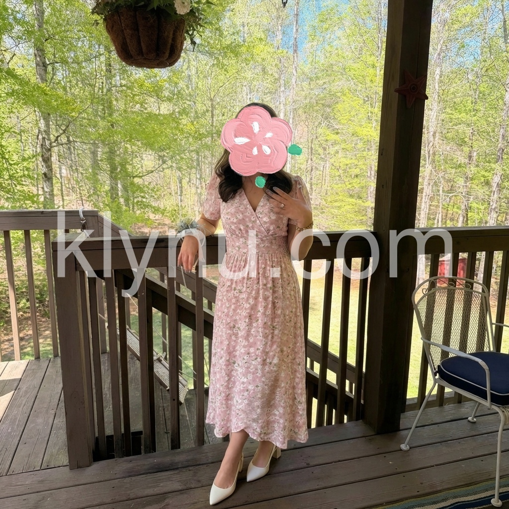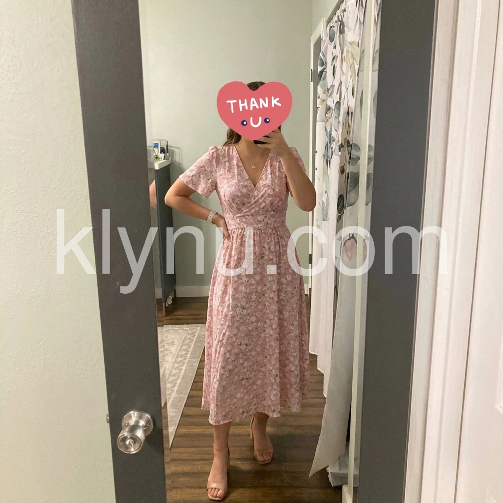 This mid-length dress features a soft pink base with delicate white floral prints. V-neckline and short flutter sleeves add feminine charm. Wrapped front design with a defined waist for a flattering fit. Lightweight fabric perfect for warm days. Ideal for brunches, garden parties, or casual outings.