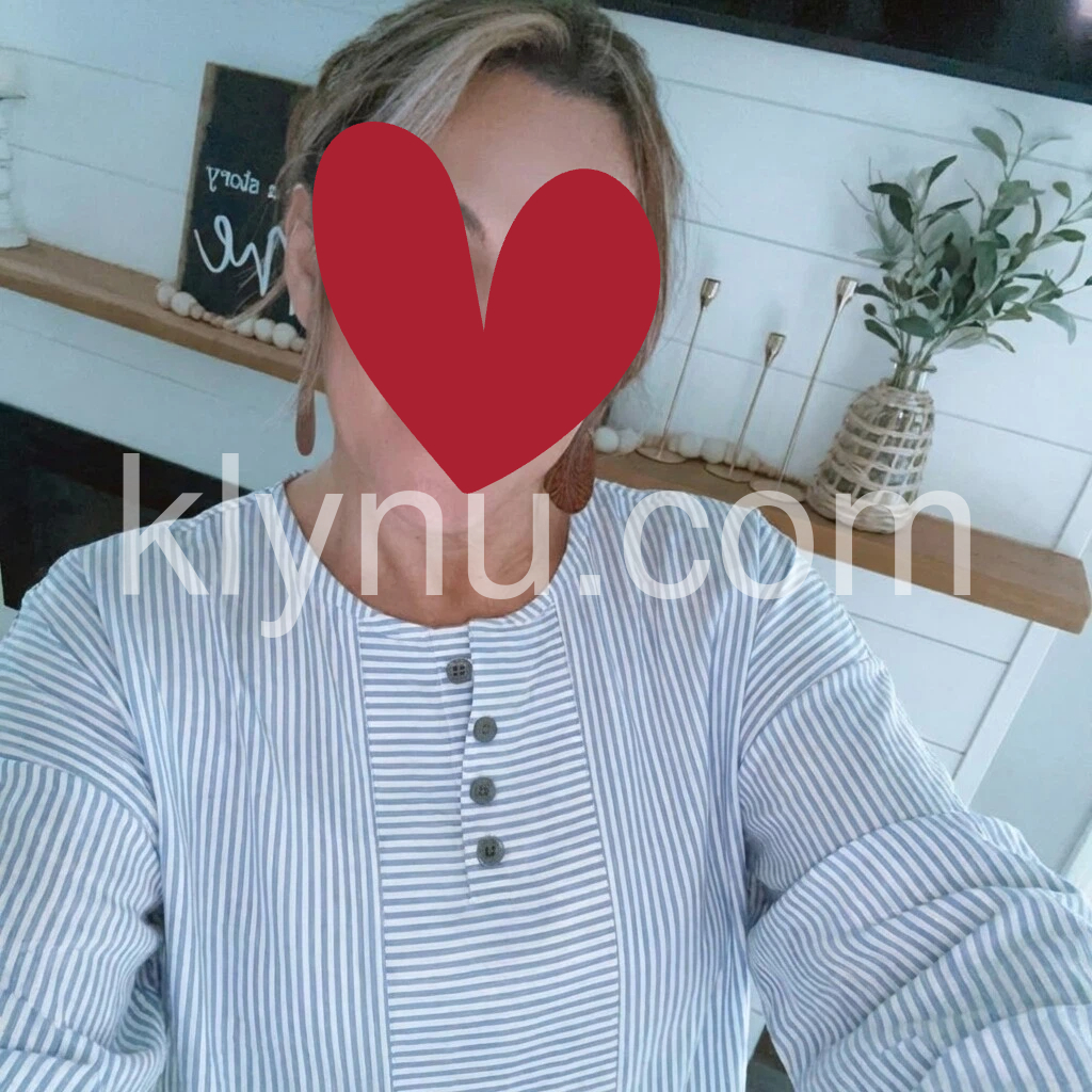 This long-sleeve top features a clean blue-and-white vertical stripe pattern with a buttoned placket. The relaxed fit and wide sleeves offer comfort and ease. Soft fabric perfect for casual wear. Ideal for pairing with jeans or pants. Simple, modern, and effortlessly chic.