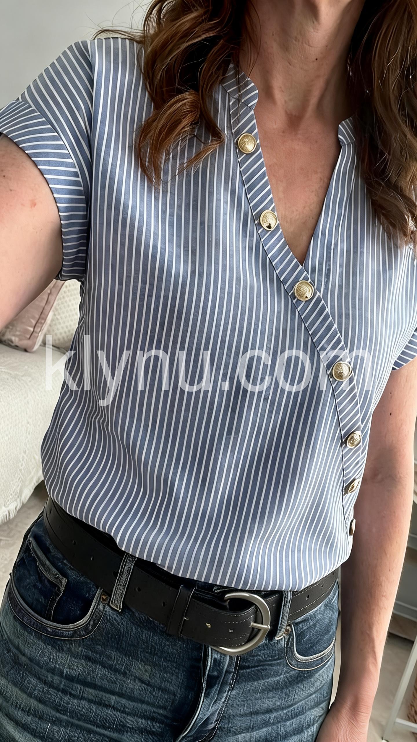 This fitted top features vertical blue and white stripes with a stylish diagonal button closure. Short flutter sleeves and a V-neckline for a feminine touch. Lightweight fabric perfect for warm weather. Ideal for casual outings or everyday wear. Effortlessly chic and comfortable.
