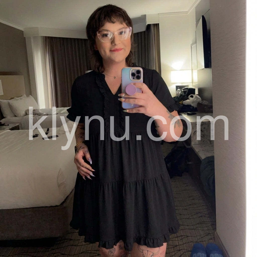 Elevate your everyday look with this Black Tiered Ruffle Short Sleeve Mini Dress, a charming and feminine silhouette that blends timeless elegance with modern comfort. Crafted from soft, lightweight fabric—likely satin or crepe—with a subtle sheen, this mini dress features a flattering V-neckline adorned with delicate ruffles that add a touch of romance and detail. The short flutter sleeves are finished with matching ruffled edges, enhancing the dress’s playful yet sophisticated vibe. A tiered skirt design creates gentle volume and movement, making it perfect for casual outings, brunch dates, or relaxed social gatherings. The mid-length hem offers versatility, while the flowy fit ensures ease and comfort all day long. Paired here with a statement necklace and a structured tote, it strikes the perfect balance between chic and effortless. Whether you're running errands or meeting friends for coffee, this black dress brings grace, style, and understated glamour to any occasion.